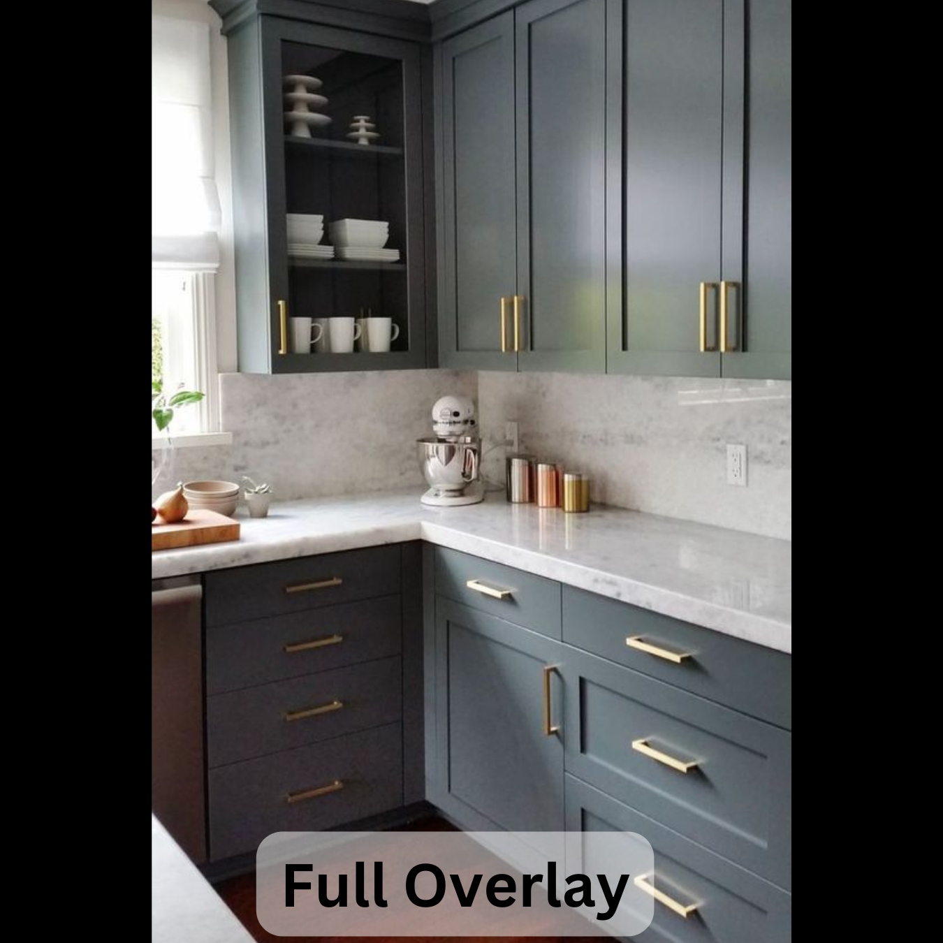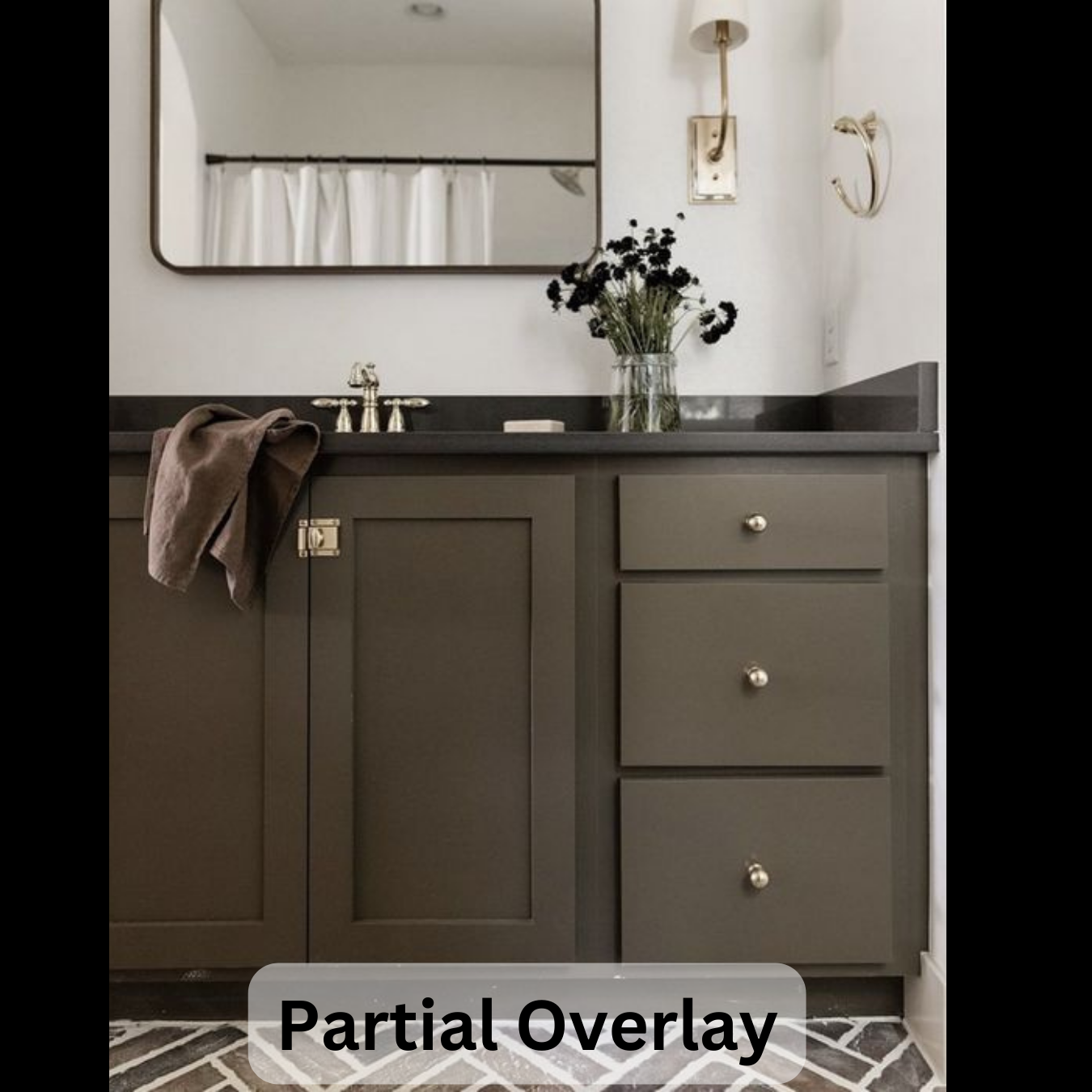 This is a cabinetry door construction style where the cabinet doors and drawer fronts are sized to cover most of the cabinet face frame, leaving minimal space (reveal) between adjacent doors. This option creates a more custom look and is one of our most popular styles.