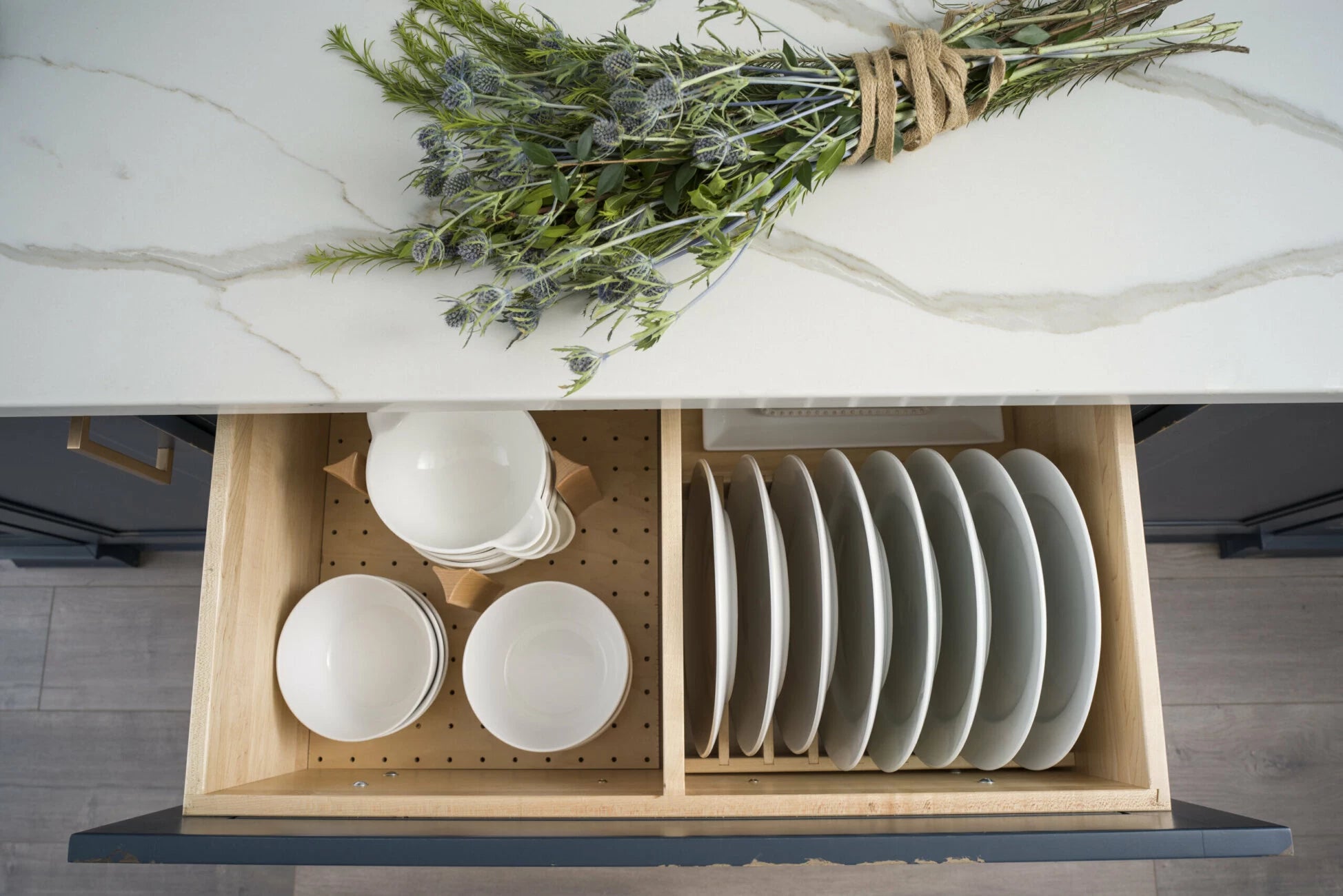 Frameless cabinets offer more accessibility verses framed cabinets. This is due to the fact that there is not an inside edge of a frame projecting into the cabinet opening. This allows an easier access to the cabinet interior as well as a larger opening to store plates, platters and cookware. The larger opening also allows for a wider drawer box in the frameless cabinetry compared to the framed cabinets of the exact same width.