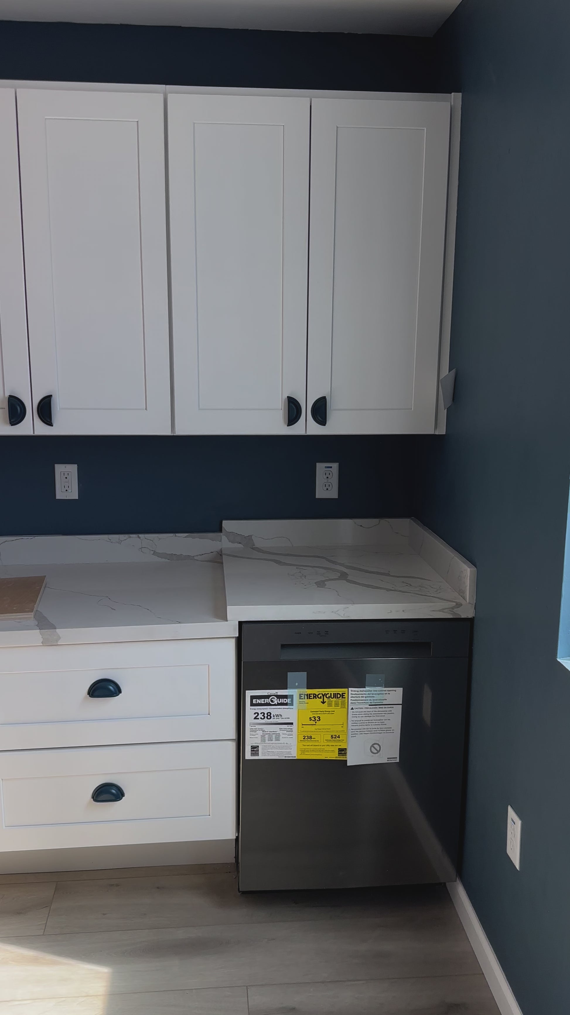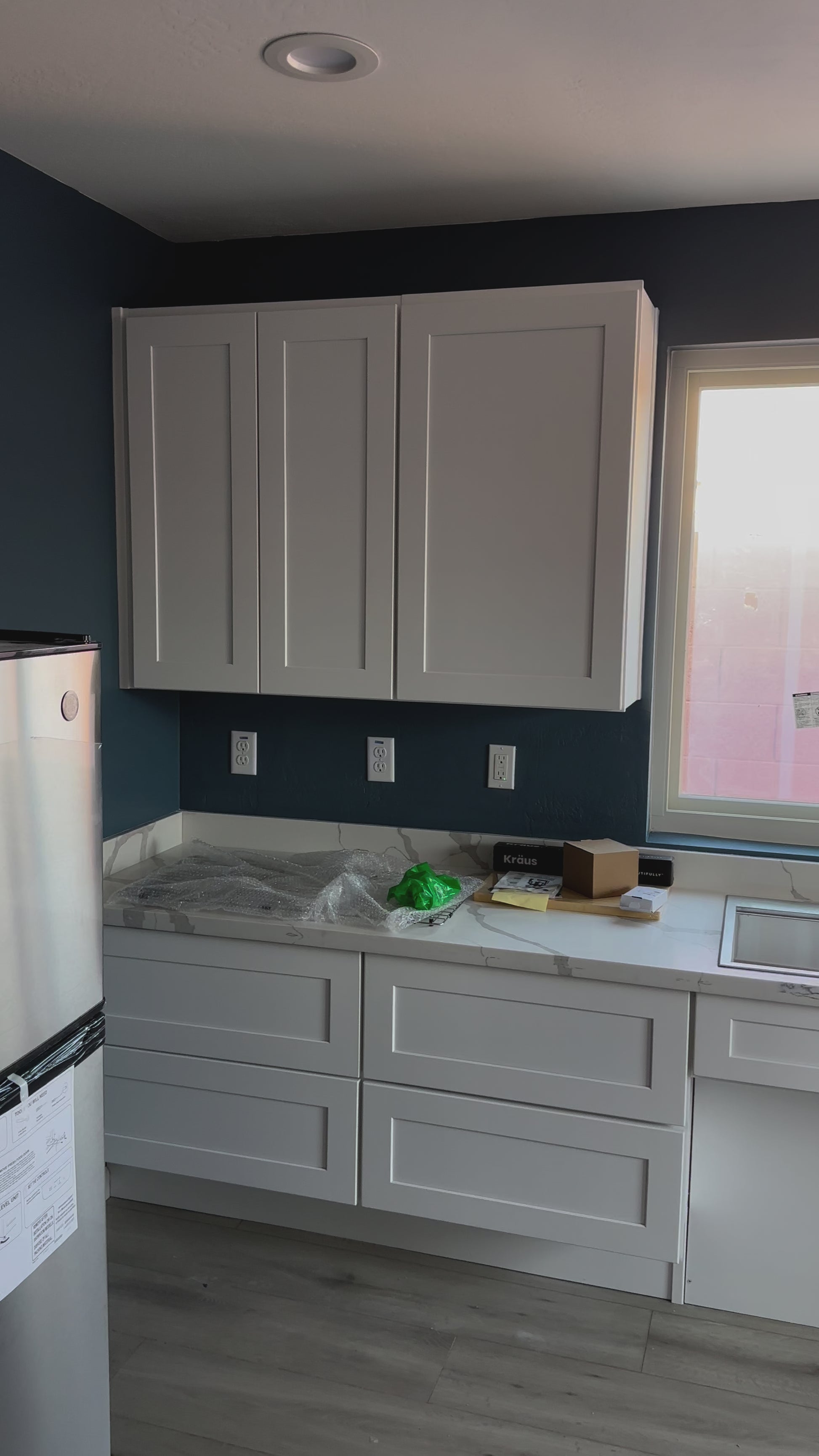 This ADA custom cabinets features a modern combination of ocean blue and white shaker, creating a modern and stylish aesthetic.