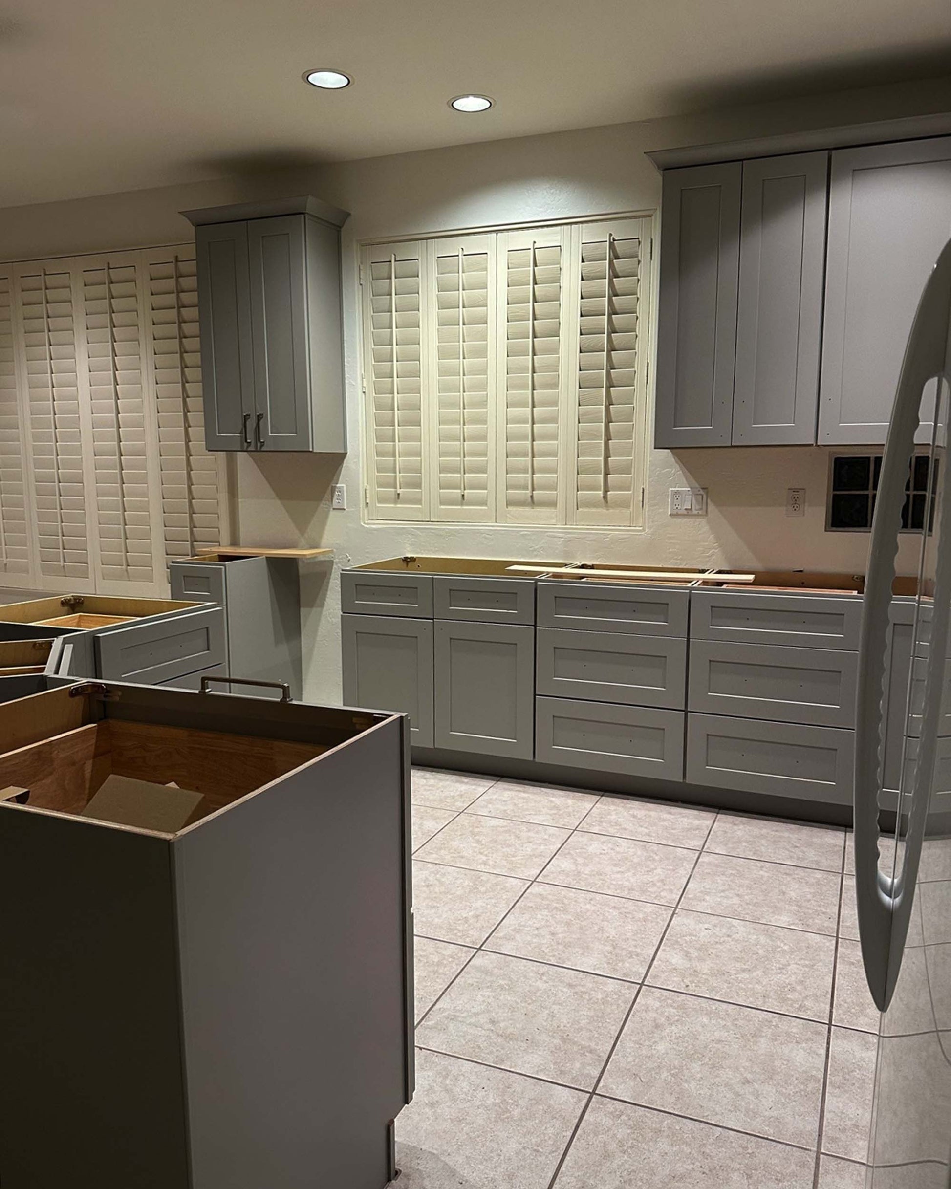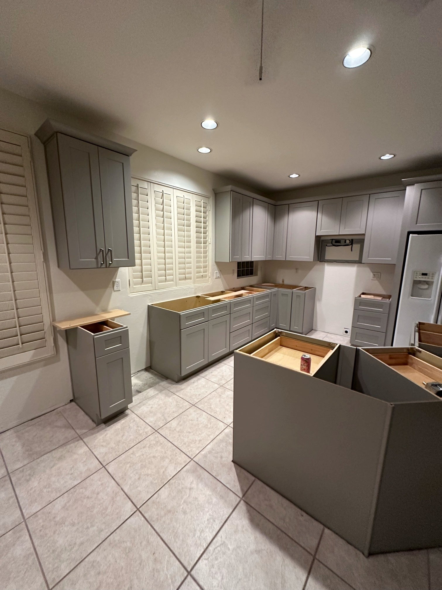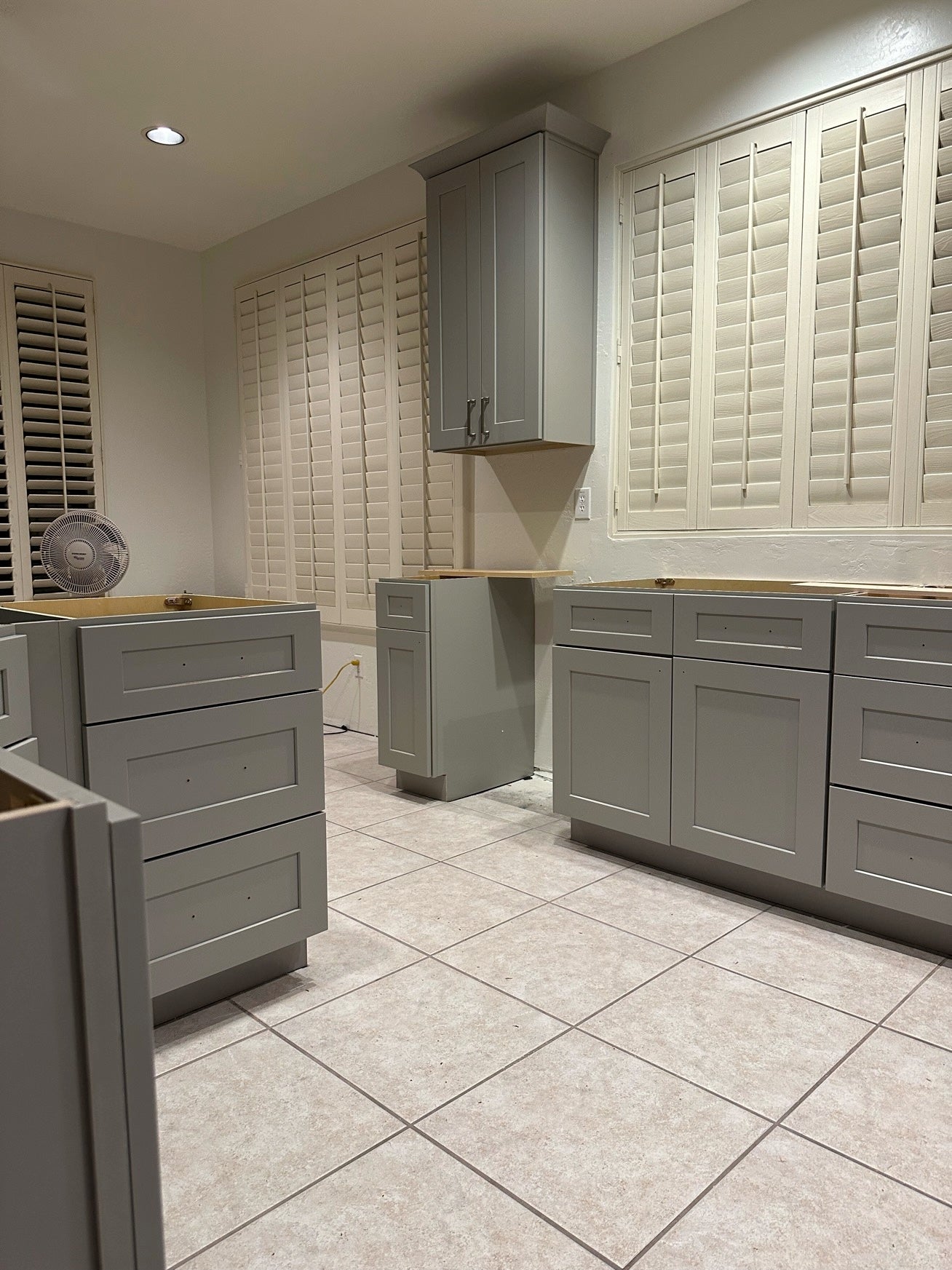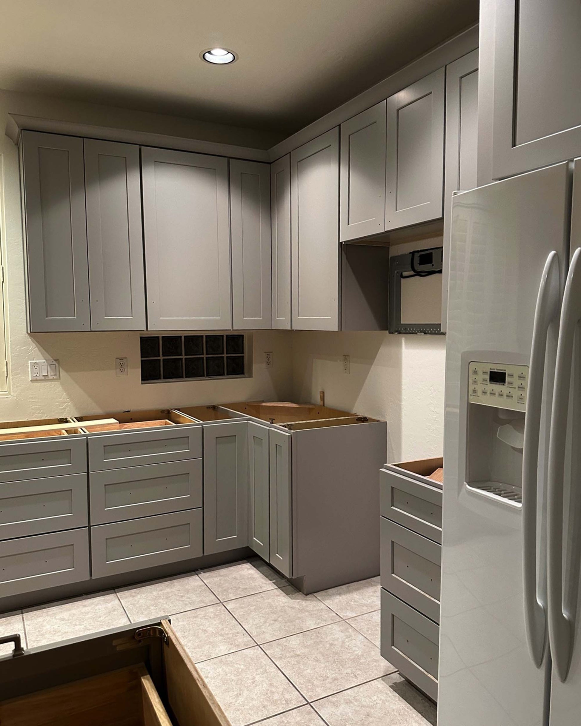 Our fine light grey cabinets, complete with a two corner island, provide both style and function. With this two corner you will have more compartments and more storage space, this project is perfect for any kitchen remodel.